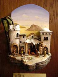 | Schwammkrippen können auch orientalisch sein. Auf einer sehr kleinen Stell- oder vielmehr Hängfläche ist eine eine Stadt eingebettet die Geburt Jesu unter einem Zeltdach dargestellt. |